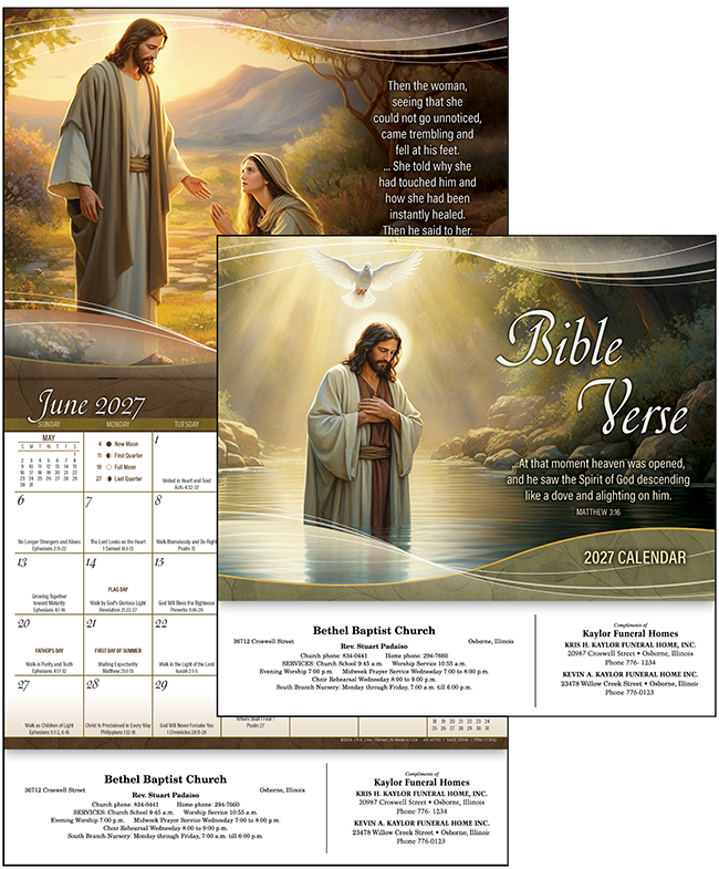 The Bible Verse calendar features religious artwork. Home daily Bible readings are listed on each day of the month, while providing ample room for family notations.