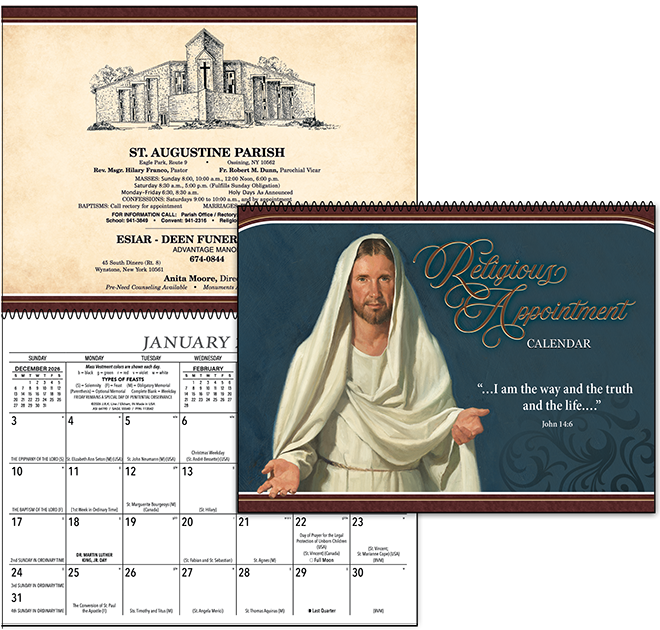 The Religious Appointment calendar will feature a line art drawing of your church on the inside cover along with custom copy for you and your sponsor. The calendar contains all necessary information for carrying out Catholic obligations.